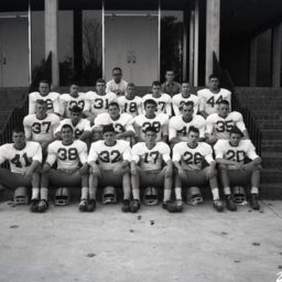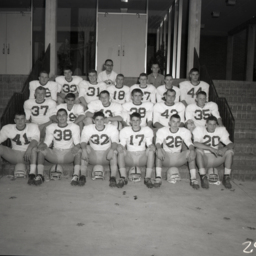 Photograph of nineteen cadets from Massanutten Military Academy (MMA) wearing their football uniforms and seated in three rows on the steps of a campus building.