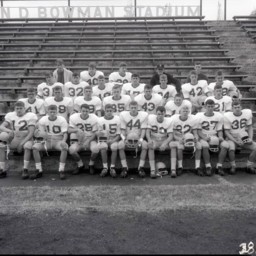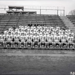 Photograph of the unidentified members of the 1964 Central High School Varsity and Junior Varsity (JV) football teams posed together outdoors.