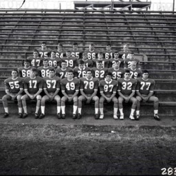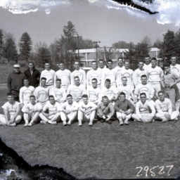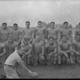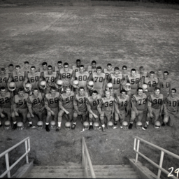 Photograph of the unidentified cadet members of the Massanutten Military Academy (MMA) football team posed outdoors on the school's Gordon D. Bowman football field in Woodstock.