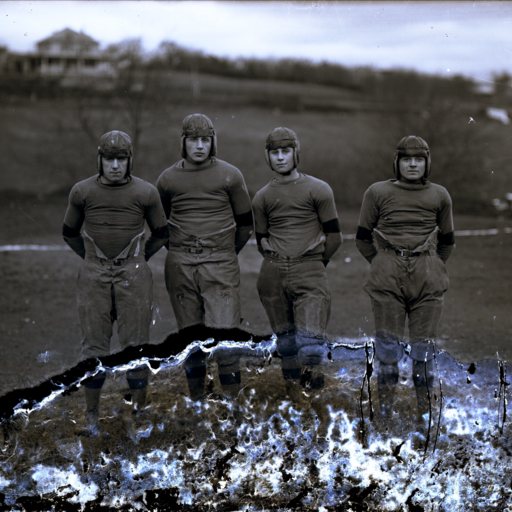 Photograph showing four Massanutten Military Academy (MMA) football players standing behind the academy's campus in Woodstock Virginia.