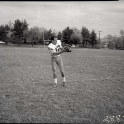 Unidentified Massanutten Military Academy cadet wearing a football uniform and shown catching a football.