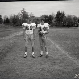 Two unidentified cadets from Massanutten Military Academy (MMA) shown in their school's football uniform and posed on MMA's football field in Woodstock.