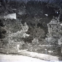 Photograph of what appears to be a fabricated display of fir trees and a model fire lookout tower. A sign on the left reads, "Shenandoah National Forest".