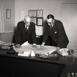 Photograph of Jacob "Jake" Haun, Sr. (left) and Ralph Bauserman (right) standing together and looking down at a set of blueprints on the desk in front of them.