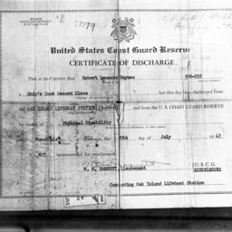 Photograph of the document certifying that Ship's Cook Second Class Robert Leonard Haynes was honorably discharged from the U.S. Coast Guard Reserve due to a physical disability.