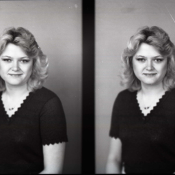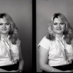 Photo of two separate portrait photographs of Diana Lee (Jett) Rinker as a young woman with long blond hair and wearing a necklace with her short-sleeved top with scalloped edges.