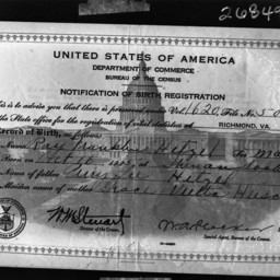 Photograph of the birth registration issued for Ray Franklin Hetzel who was born on October 16, 1925, in Shenandoah County.