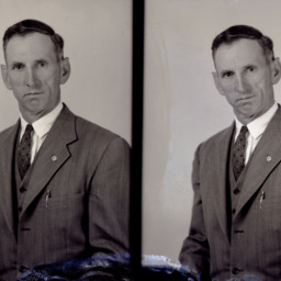 Photo of two separate portrait photographs of Frank E. Hoover, Sr. in a suit and tie with a pin on his lapel.