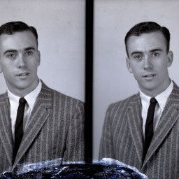 Photo of two separate portrait photographs of Ronald Hoover as a young man in a striped suit jacket and tie.