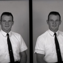 Photo of two separate portrait photographs of Dean Hoover wearing a short-sleeved shirt and tie.