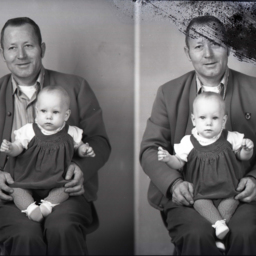 Photo of two separate photographs of Harvey Lee Huffman, Sr., seated, and holding an unidentified young child on his lap.