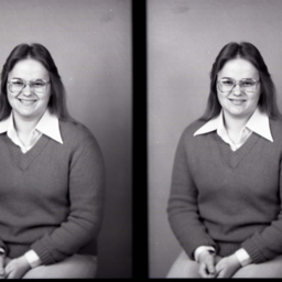 Photo of two separate portrait photographs of Barbara Ann (Bowman) Huffman as a young woman with glasses and long hair.