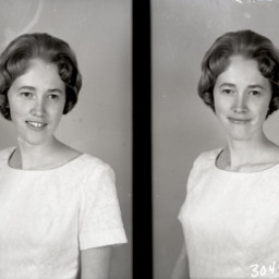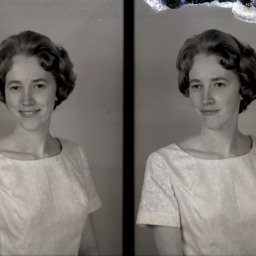 Photo of two separate portrait photographs of Carolyn Faye (Tusing) Jennings as a young woman with short, styled hair.