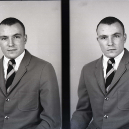 Photo of two separate portrait photographs of Landon Steve Jennings in a suit and striped tie.