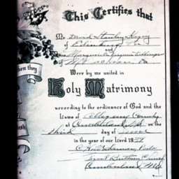 Photograph of a marriage certificate attesting that David Stanley Kagey of Edinburg, and Marguerite Virginia Dellinger of Mt. Jackson, Virginia, were married in Cumberland, Allegany County, Maryland, on June 3, 1939.
