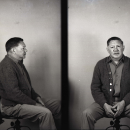 On the left, he is shown in profile. On the right, he is facing the camera, seated, and wearing a sweater with buttons.