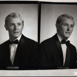 Photo of two separate portrait photographs of Billy Logan in a formal suit and bow tie.