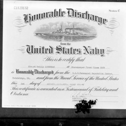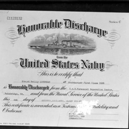 Photograph of the document certifying that Storekeeper First Class Edward Reilly Lonergan was honorably discharged from the Navy in Bainbridge, Maryland, on October 3, 1945.