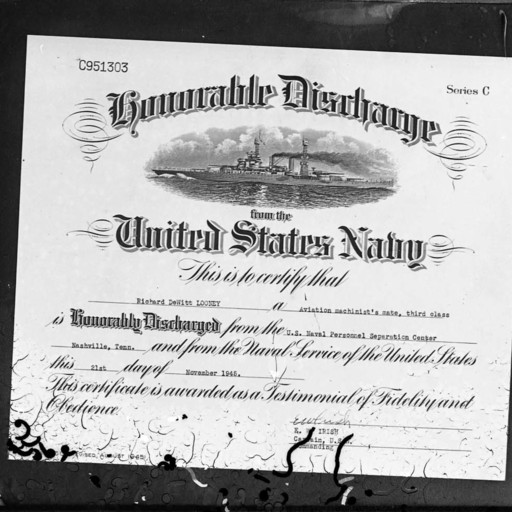 Photograph of the document certifying that Aviation Machinist Mate Third Class, Richard DeWitt Looney, was honorably discharged from the Navy in Nashville, Tennessee, on November 21, 1945.