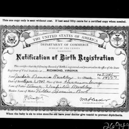 Photograph of a Marriage certificate attesting that Elmer Winfield Markley of Bird Haven and Hilda Bernice Barb of Basye, were married in Winchester, Virginia, on November 30, 1940.