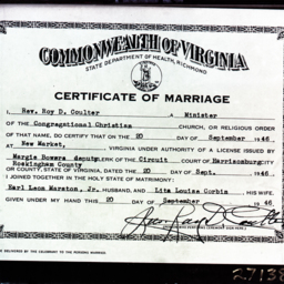 Photograph of a marriage certificate attesting that Earl Leon Marston, Jr. and Lita Louise Corbin were married in New Market, Virginia, on September 20, 1946.