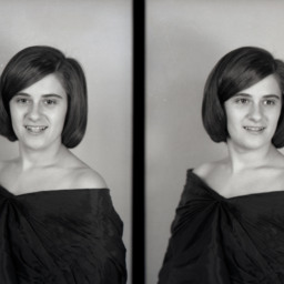 Photo of two separate portrait photographs of L. Kay (Marston) Bowman as a young woman with short hair.