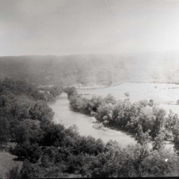 The image shows the camp, river, and a view of the Massanutten Mountain. Camp buildings and tents are visible in the center of…