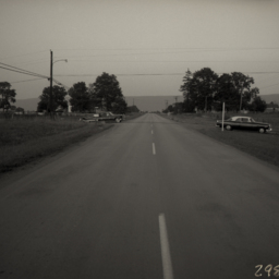 A 1920's era automobile is visible on the road and a house is on the right. Mountains are also visible.