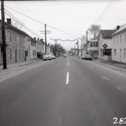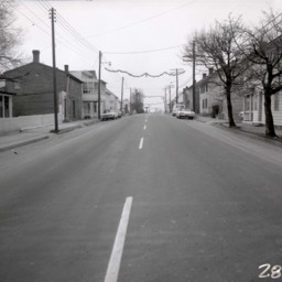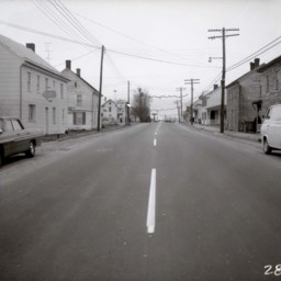 The photograph was taken in winter. Houses, buildings, and vehicles are visible on both sides of the street.
