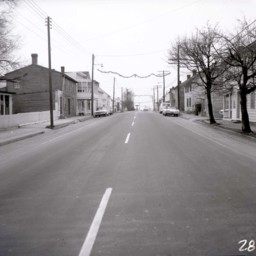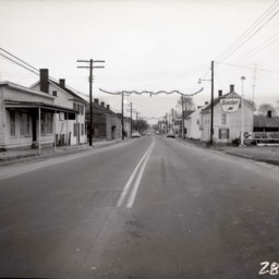 Buildings and telephone poles/wires are visible on both sides of the street.
