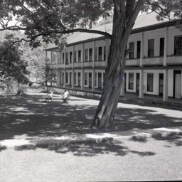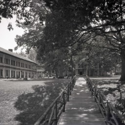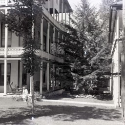 The view includes a wooden walkway that parallels a wing of the hotel and leads to the back entrance of the main building. A shade tree is on the right.