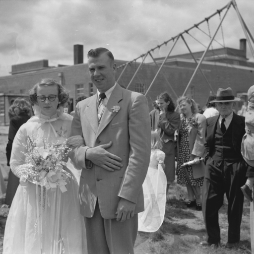 Photograph of the May King Kenneth Hawkins and May Queen Joanne Philips at the Triplett School May Day celebration taken on May 13, 1952.
