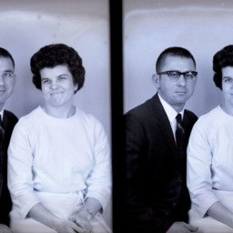 Photo of two separate photographs of Jim Phillips and his wife, Wanda (Fadeley) Phillips, posed together.