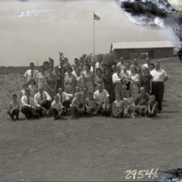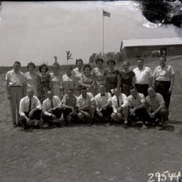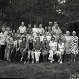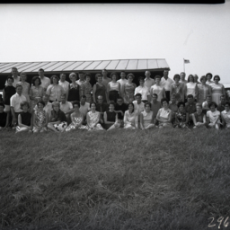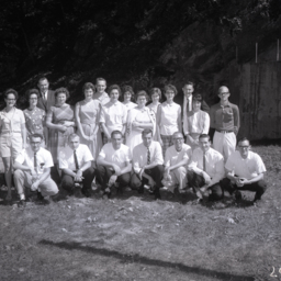 Group of unidentified men and women posed in three rows outdoors at a park.