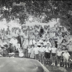 Photograph showing members of the Lantz family at a picnic. Ten individuals have been identified by Wenona Lantz as being in the photograph. They are from left to right, back row first: