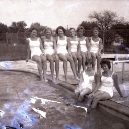 Eight unidentified young women, mostly teen-aged, are wearing matching swimsuits and posed, seated, on the diving board or on the edge of the Woodstock Pool.