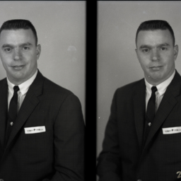 Photo of two separate portrait photographs of William Propst wearing a suit and tie with a handkerchief monogrammed with the letter, "P", sticking out of his breast pocket.