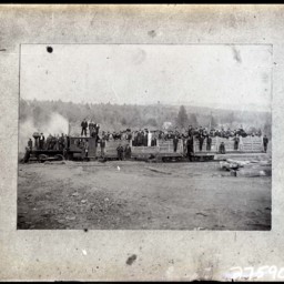 Photo of a photograph of a train locomotive and two open cars loaded with people.