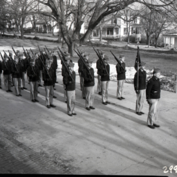 Group of unidentified cadets from Massanutten Military Academy (MMA) are standing in parade formation in front of Lantz Hall, with rifles on their shoulders.
