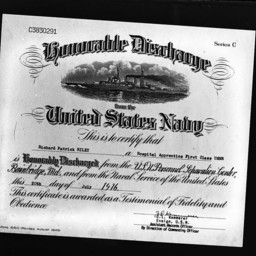Photograph of the document certifying that Hospital Apprentice First Class Richard Patrick Riley was honorably discharged from the Navy in Bainbridge, Maryland, on July 20, 1946.