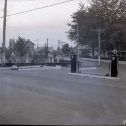 The photograph was taken from behind two gas pumps and beside a cemetery.