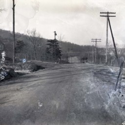 Photograph of an unidentified paved road as it crosses railroad tracks.