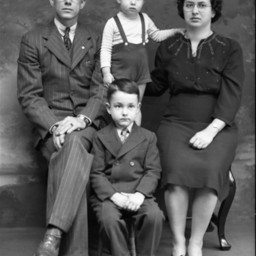 Photograph of Lester Ryman in a striped suit and tie, seated beside his wife, Reba (Hottle) Ryman. His son, Nelson is standing on the bench between them and an older son, Wilson, is posed in front.