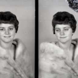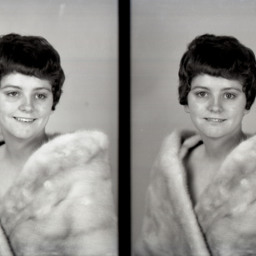 Photo of two separate portrait photographs of Sharon Ryman as a young woman with short hair and wearing a fur stole.
