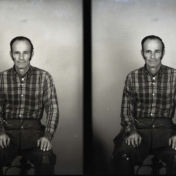 Photo of two separate portrait photographs of Ernest Calvin Ryman, seated, with sideburns and wearing a plaid, long-sleeved shirt.