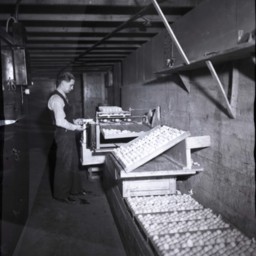 Unidentified man is standing by a conveyor belt filled with chicken eggs. He appears to be sorting them.