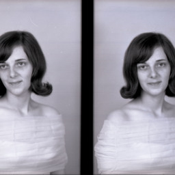 Photo of two portrait photographs of Chellis Marie (Baker) Shirkey as a young woman with her hair curled outwards.