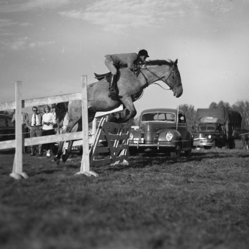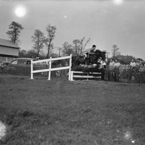 Photograph of Fred Sigler on a horse making a jump at the Triplett School Fair taken on October 19-20, 1950.