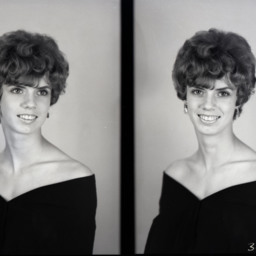 Portrait photograph of Janet (Long) Sine as a young woman with her short hair held with a barrette.