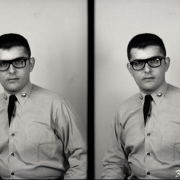 Photo of two separate portrait photographs of an unidentified young man with glasses wearing a U.S. Army uniform.